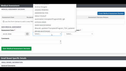 Once an organ referral is accepted, the transplant program’s primary consulting physician performs a medical assessment. Information about the assessment and the assessment decision must be logged so that the recipient can continue, end, or temporarily postpone their transplant journey.